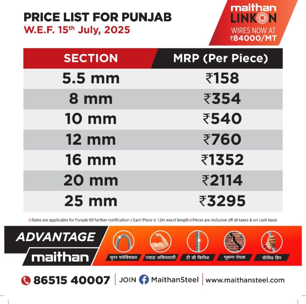 Maithan Linkon Wires are available at ₹81,500/MT. Prices include all taxes and are based on cash transactions. Each piece measures exactly 12 meters.